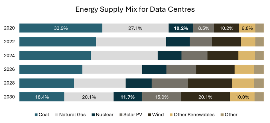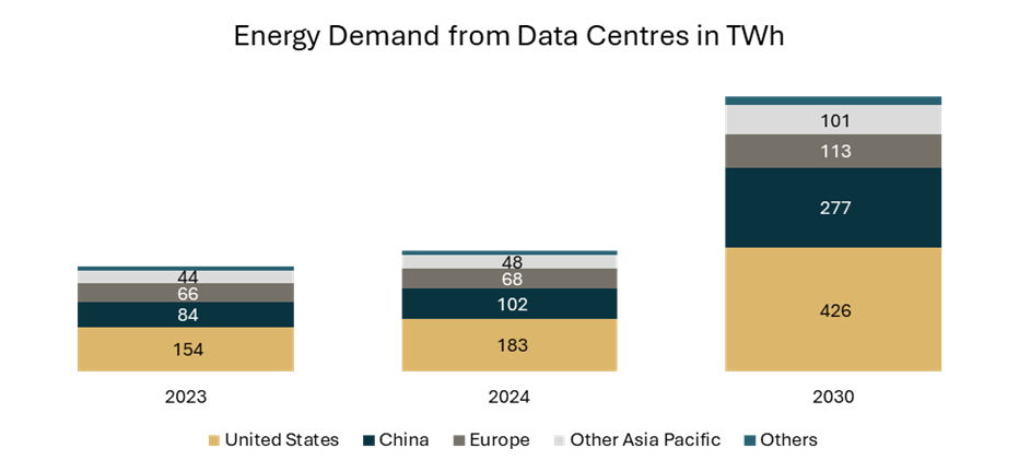 However, the sentiment around nuclear energy and thus demand for Uranium is changing. Artificial intelligence has triggered a surge in electricity consumption which is providing early tailwinds for demand for Uranium. Global data centre power demand could rise from 416 TWh in 2024 to 946 TWh by 2030 increasing 127%, equalling Japan’s annual usage, according to the IEA. Training and deploying AI systems rely on continuous, high-load energy—training of large models like GPT‑3 alone consumed energy comparable to that used by 120 homes over a year.