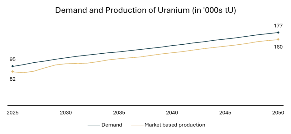 The Internation Atomic Energy Association (IAEA) forecasts uranium demand will rise 86% from 2025-2050 as global nuclear capacity expands from 398 GW to more than 750 GW. Rapid growth in SMRs and reactor fleet additions will outpace current output.