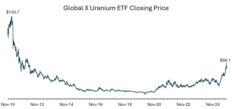 The event sparked global fear over nuclear safety and led to widespread public opposition to nuclear energy. Countries like Germany, Italy, and Switzerland accelerated nuclear phaseouts, while global confidence in nuclear power sharply declined, marking the end of a brief “nuclear renaissance” and reigniting scepticism toward its safety. As a result, the Global X Uranium ETF, an ETF tracking nuclear energy producers and miners, declined sharply thereafter.