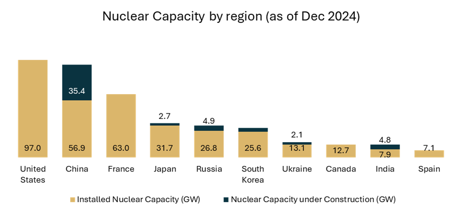 China: China’s nuclear expansion, guided by the 14th Five-Year Plan (2021–2025), which targets 70 GW of installed capacity by the end of 2025 and outlines a path toward 200 GW by 2035. This translates to about 6–8 new reactors added annually, with most projects completed within seven years—far faster than in Western countries. Nuclear energy’s share of China’s total electricity is expected to rise from 5% in 2024 to 10% by 2040.