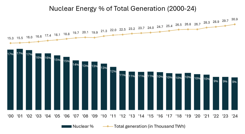 Recently, global nuclear power generation reached a new peak in 2024 at 2,778 TWh, growing by 2.9% (78 TWh) after a similar rise in 2023 (2.3%). However, despite this record output, nuclear energy’s share of the global electricity mix fell to its lowest point in over 45 years—just 9%.