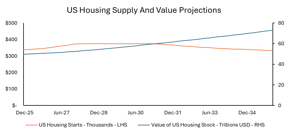 However, long-term prospects are supported by both demographic and policy fundamentals. Industry projections from Morgan Stanley indicate the U.S. will need approximately 18 million additional units by 2035 to close the supply gap caused by years of chronic underbuilding. Single-family starts are forecast to average over 1.5 million units per year from 2025 to 2029, with growth resuming as affordability improves and financing conditions normalize. Millennials and Gen Z will drive structural demand as they reach household formation milestones.