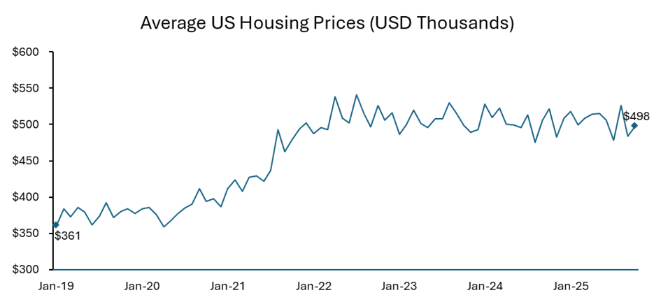 Typically, such rate hikes would depress housing demand and moderate prices. However, the entrenched lack of housing supply has kept price pressures elevated. From 2019 to 2025, average home prices climbed sharply, bringing the average single-family home price to close to USD 500 thousand.