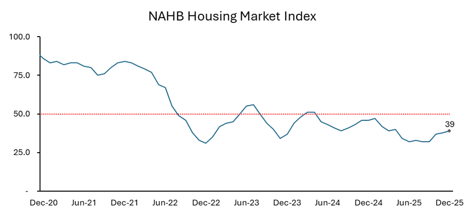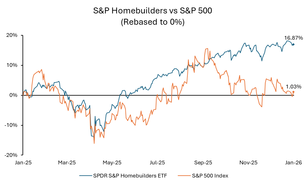 Looking forward, the near-term trajectory for homebuilders appears muted. NAHB builder sentiment indices remained in the 30s for much of 2025, reflecting negative outlooks and buyer hesitancy. A higher reading (>50) is an indication that most builders feel confident about the current and near-term outlook for housing.