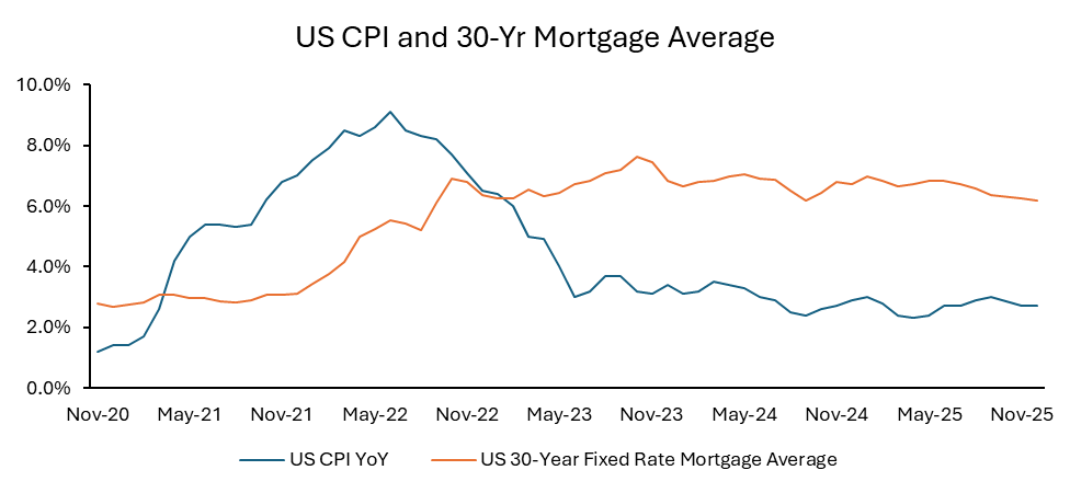 Research by J.P. Morgan shows that over 80% of current borrowers are more than 1 percentage point below prevailing mortgage rates, further limiting household mobility and, thus, home sales. As a result, housing activity is likely to remain subdued through at least mid-2026, supported mainly by incentives and modest pricing adjustments.